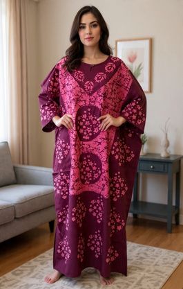 Velmi pohodlný kaftan je vyroben z příjemného a kvalitního bavlněného plátna. Skvěle se hodí na domácí nošení. Zdobí ho tradiční voskovaná batika ze Západního Bengálska. V pase lze stáhnout provázkem.