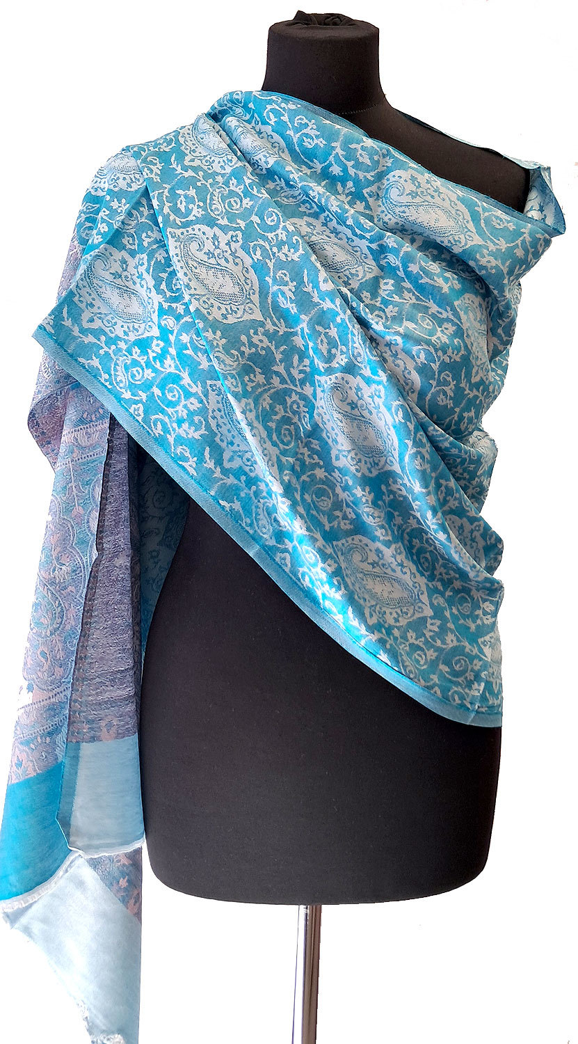 Jako úplnou novinku představujeme lehounkou, ale hřejivou šálu, která je zdobená tradičním kašmírovým vzorkem vytkaným brokátovou technikou. Zakončují ji výrazné, zdobené okraje. Je velmi příjemná na dotek i na nošení. Hodí se jak k evropskému, tak k orientálnímu oblečení.