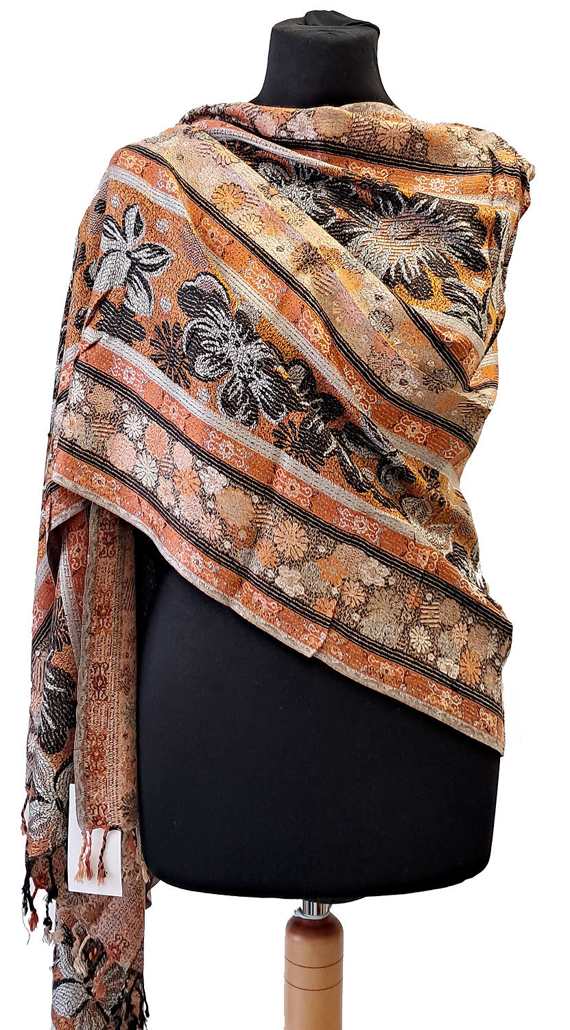 Luxusní, precizně zpracovaná šála překvapí náshedným vzorem s dokonale sladěnými barvami. Je dokonalou kopií několikanásobně dražších hedvábných šál a proto se velmi jemně leskne. Zdobí ji krásné indické ornamenty. Dokonale se hodí jak jako šála, tak jako pléd k šatům. Nádherně hřeje!