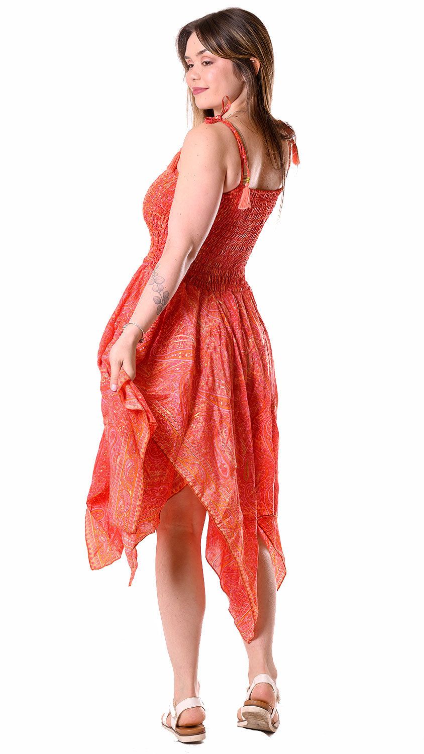Jako úplnou novinku vám představujeme tyto fantastické cípaté šaty, ušité z originální, jemné látky, které se kromě nádherných barev a tradičního kašmírového vzorku může pochlubit i nemalou porcí zlata. A skvělý je i střih - díky žabičkové gumě skvěle sedí, ať už v podobě šatů nebo sukně. Stane se vaším nejlepším přítelem na dovolené - nejen, že budete mít dva kousky oblečení v jednom, ale také se nemačká a bleskurychle schne.