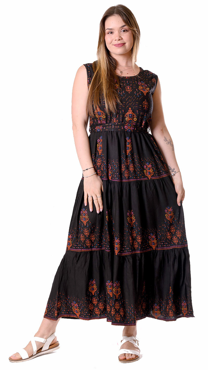 Nádherné šaty z Indie jsou vyrobeny z kvalitního a příjemného materiálu. Mají pohodlný střih, který navíc lichotí postavě. Chválíme indického krejčího za to, že na látce nešetřil, a tak jsou šaty krásně široké – vytvářejí áčkový princeznovský střih. Jejich největší předností jsou jejich nádherné indické barvy a vzory, které vycházejí ze severoindických tradičních ornamentů, a také jejich pásek zakončený výraznou ozdobou. Šaty jsou bez rukávů, uvnitř jsou ale rukávky přistehovány – můžete si je přišít.