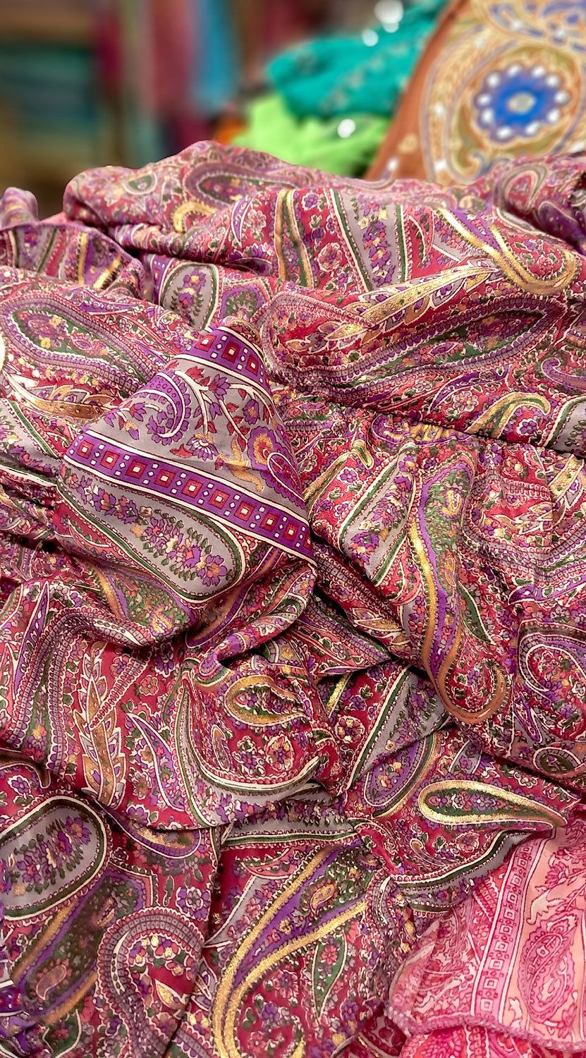 Tato sukně je bohatě zdobena nádhernými indickými vzory, pečlivě sladěnými do harmonických barevných tónů, které navíc rozzářil zlatý tisk. Každý detail vypráví příběh a dodává sukni jedinečný a sofistikovaný vzhled, ve kterém se budete cítit výjimečně.