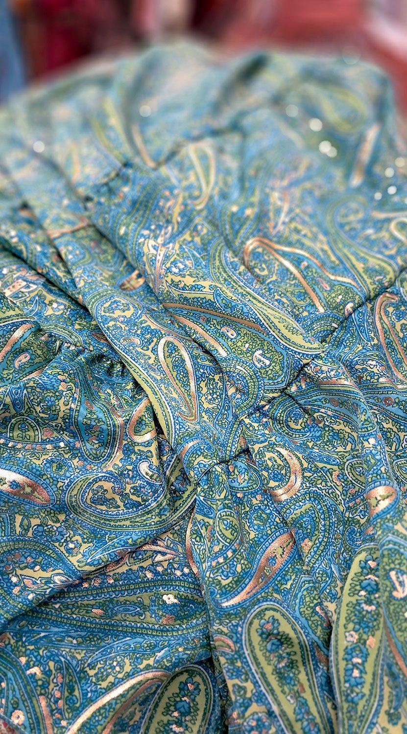 Tato sukně je bohatě zdobena nádhernými indickými vzory, pečlivě sladěnými do harmonických barevných tónů, které navíc rozzářil zlatý tisk. Každý detail vypráví příběh a dodává sukni jedinečný a sofistikovaný vzhled, ve kterém se budete cítit výjimečně.