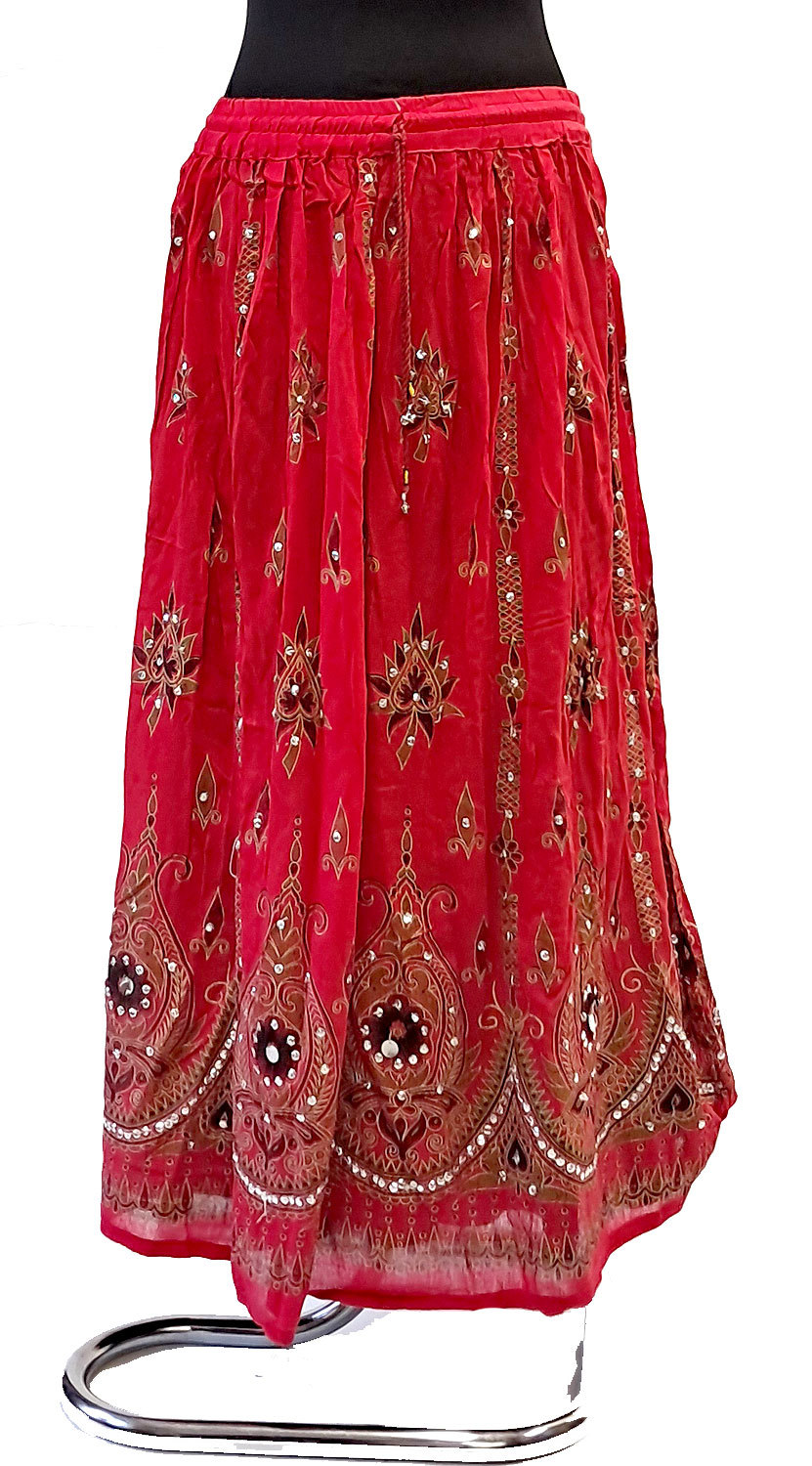 Tato sukně je vyrobena z mimořádně příjemného a prodyšného materiálu, který zaručuje pohodlí po celý den. Její povrch zdobí tradiční indické motivy, které jsou doplněny výraznými flitry. Tyto flitry zachycují světlo a dodávají sukni decentní, avšak oslnivý lesk s každým pohybem.