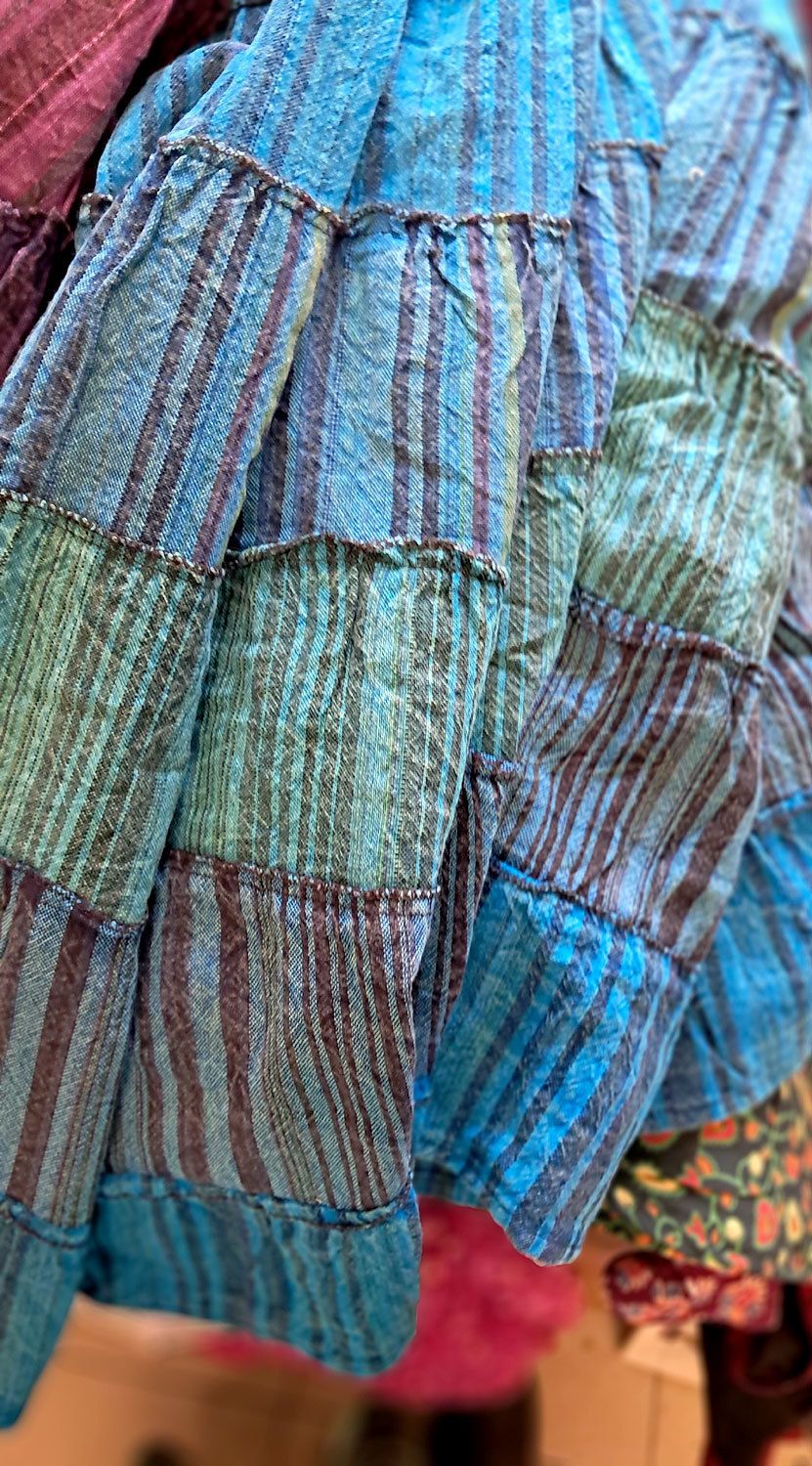 Tato širokánská bohatá sukně nás láká svým kvalitním, příjemným a dokonce i hřejovým materiálem a v neposlední řadě také dokonale sladěnými barvami. Dá se nosit i jako šaty, pokud si žabičkovou část posunete až na hrudník.