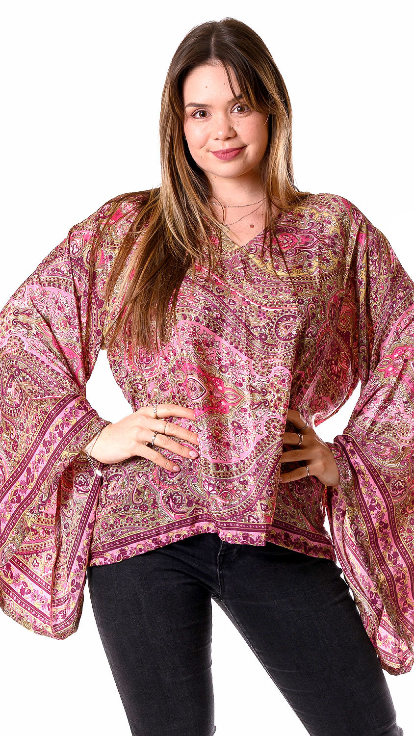 Jako úplnou novinku vám představujeme tyto exkluzivní zlaté topy, vyrobené z hedvábně jemné látky. Nejen, že je zdobí ten nejkrásnější a barevně nejsladěnější vzorek, ale navíc mají velmi volný, pohodlný střih a nosí se velmi příjemně. Moc jim sluší rozšířené rukávy, které mají délku, která nezavazí a nebrání v pohybu.
