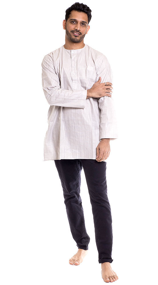 Tradiční pánská indická košile kurta (kurti) pochází původně z Persie. Má velmi pohodlný a volný střih, lze nosit k džínům, plátěným kalhotům, ale i k formálnějšímu oblečení. Po stranách má dvě kapsy. Je vyrobena z podomácky předené a tkané látky, vyznačující se jasně zřetelnou osnovou a také vysokou odolností. Tuto kurti pro nás na zakázku ušil náš indický krejčí :)