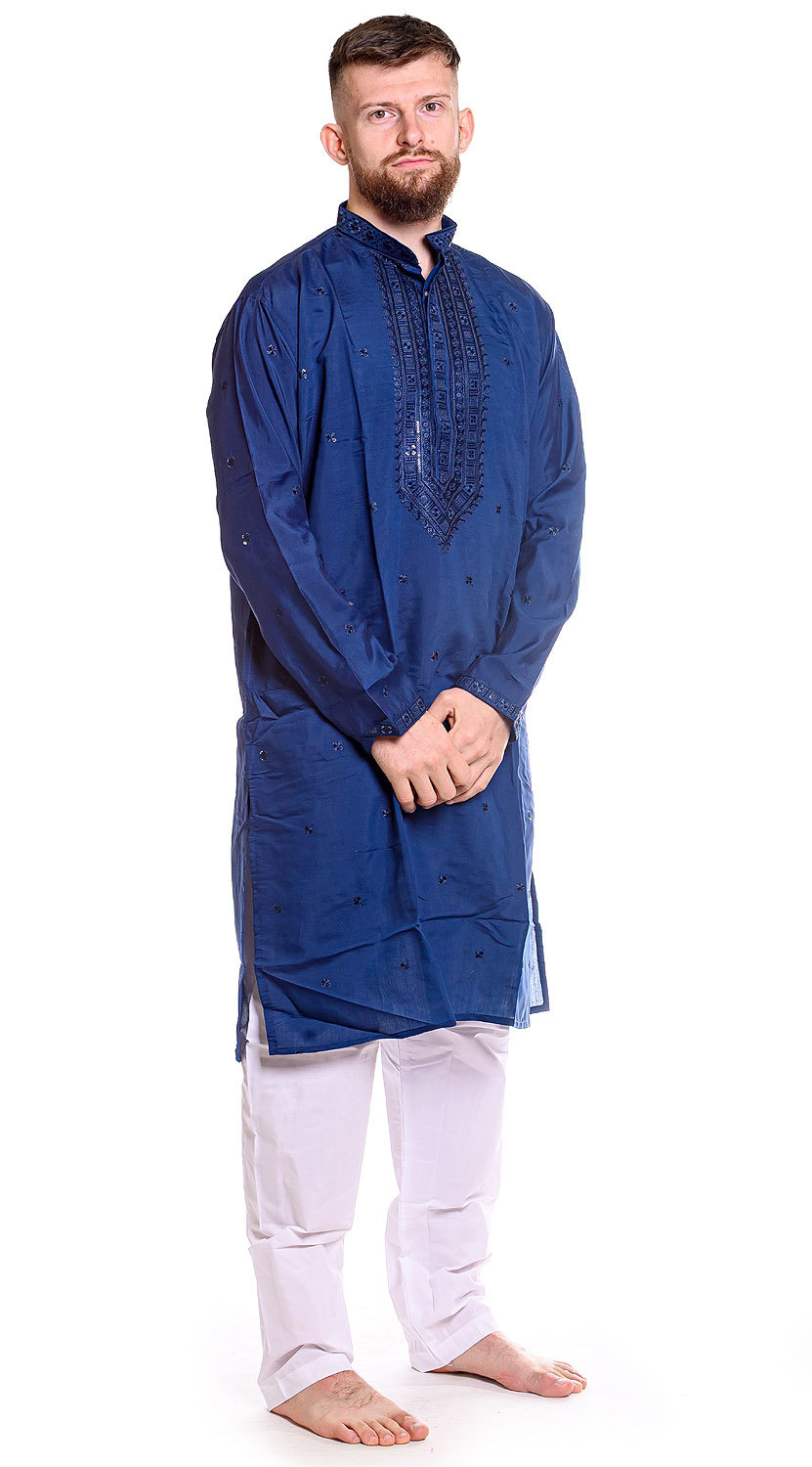 Nádherná slavnostní kurta v tradičním maharádžovském stylu je vyrobena z příjemné látky, na které se jemně leskne precizní bohatá výšivka, kteoru je zdobena a která je prominentní zejména v přední části pod krkem a nese se v klasickém duchu. Je dokonalým oblečením na indické svatby či jiné slavnostní události. Má kapsy!