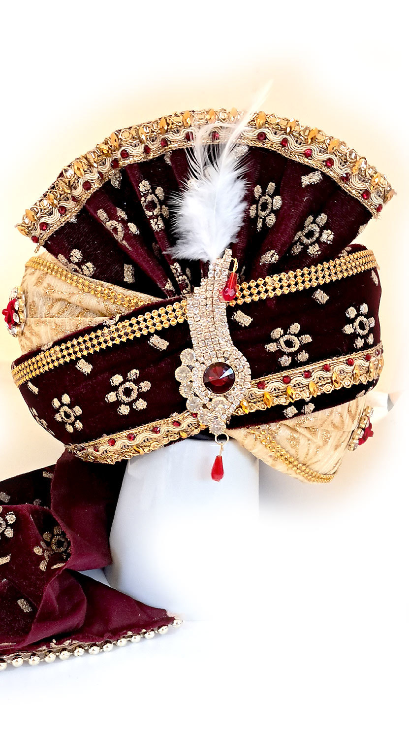 Neodmyslitelná součást slavnostního indického oděvu v luxusním provedení - krásná blyštivá látka, tradiční kombinace vínové a slonovinové a k tomu velká dávka třpytivých kamínků a dalších ozdob. Turban je vyrobený z měkké látky, takže na hlavě dobře sedí a netlačí.