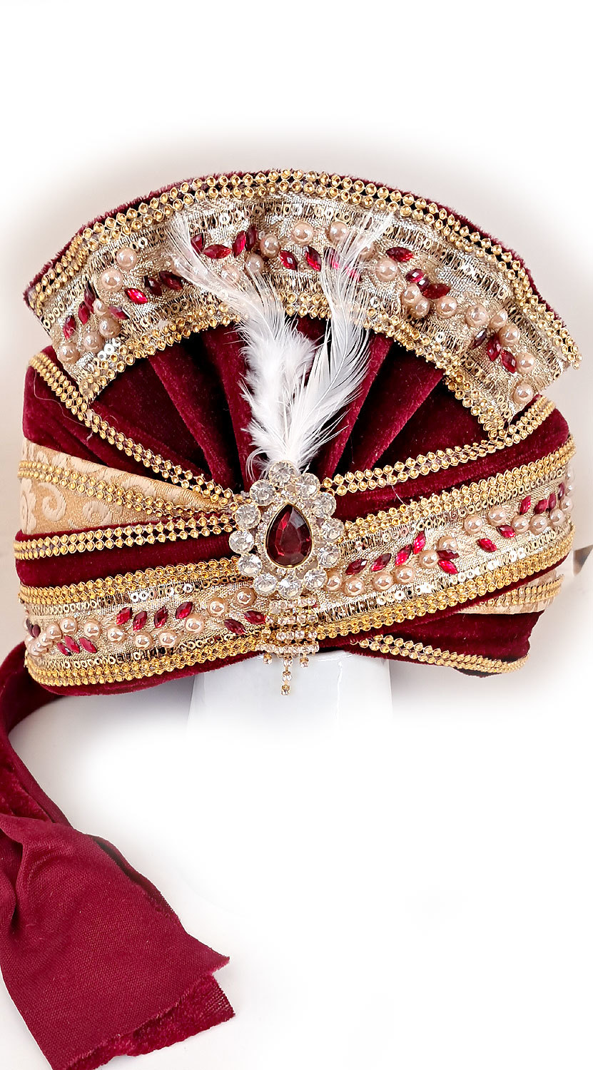 Neodmyslitelná součást slavnostního indického oděvu v luxusním provedení - krásná blyštivá látka, tradiční kombinace vínové a slonovinové a k tomu velká dávka třpytivých kamínků a dalších ozdob. Turban je vyrobený z měkké látky, takže na hlavě dobře sedí a netlačí.