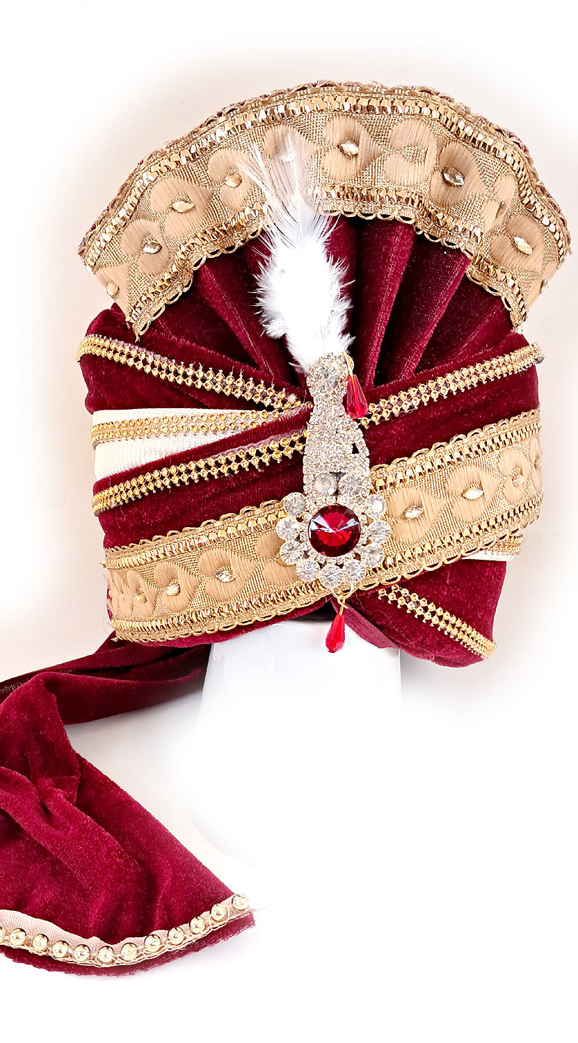 Neodmyslitelná součást slavnostního indického oděvu v luxusním provedení - krásná blyštivá látka, tradiční kombinace vínové a slonovinové a k tomu velká dávka třpytivých kamínků a dalších ozdob. Turban je vyrobený z měkké látky, takže na hlavě dobře sedí a netlačí.