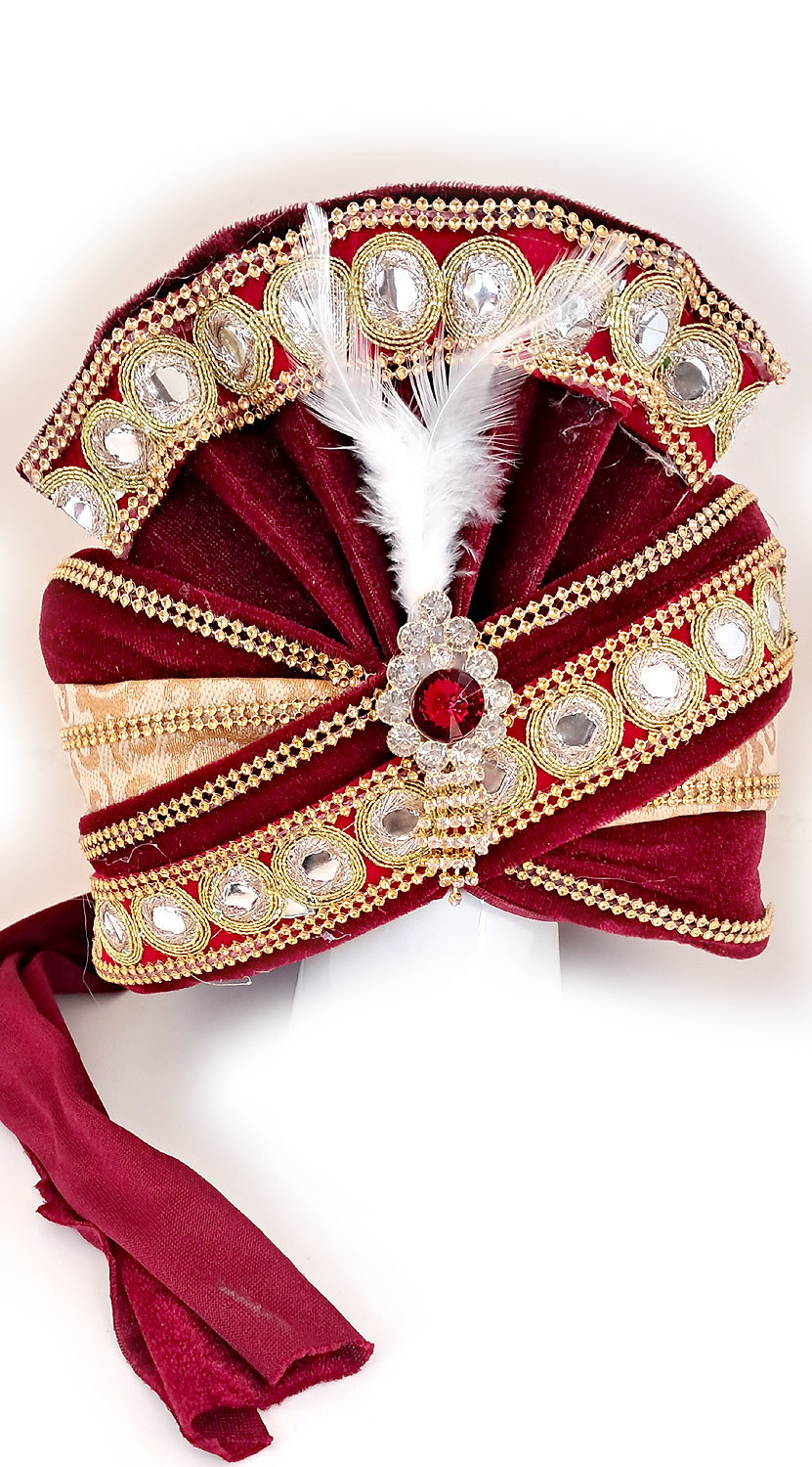 Neodmyslitelná součást slavnostního indického oděvu v luxusním provedení - krásná blyštivá látka, tradiční kombinace vínové a slonovinové a k tomu velká dávka třpytivých kamínků a dalších ozdob. Turban je vyrobený z měkké látky, takže na hlavě dobře sedí a netlačí.