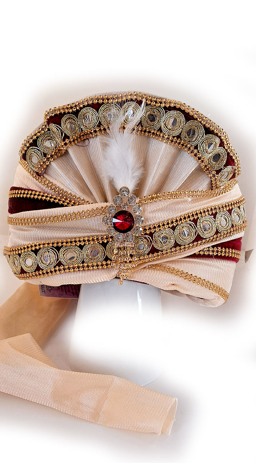 Neodmyslitelná součást slavnostního indického oděvu v luxusním provedení - krásná blyštivá látka, tradiční kombinace vínové a slonovinové a k tomu velká dávka třpytivých kamínků a dalších ozdob. Turban je vyrobený z měkké látky, takže na hlavě dobře sedí a netlačí.