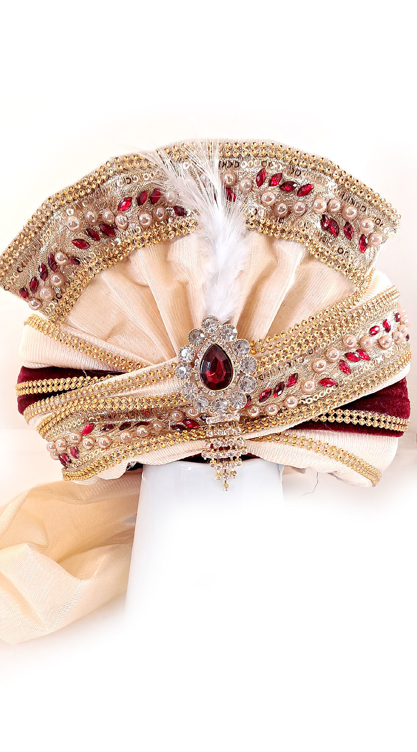 Neodmyslitelná součást slavnostního indického oděvu v luxusním provedení - krásná blyštivá látka, tradiční kombinace vínové a slonovinové a k tomu velká dávka třpytivých kamínků a dalších ozdob. Turban je vyrobený z měkké látky, takže na hlavě dobře sedí a netlačí.