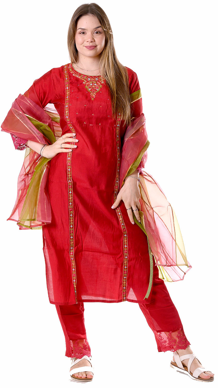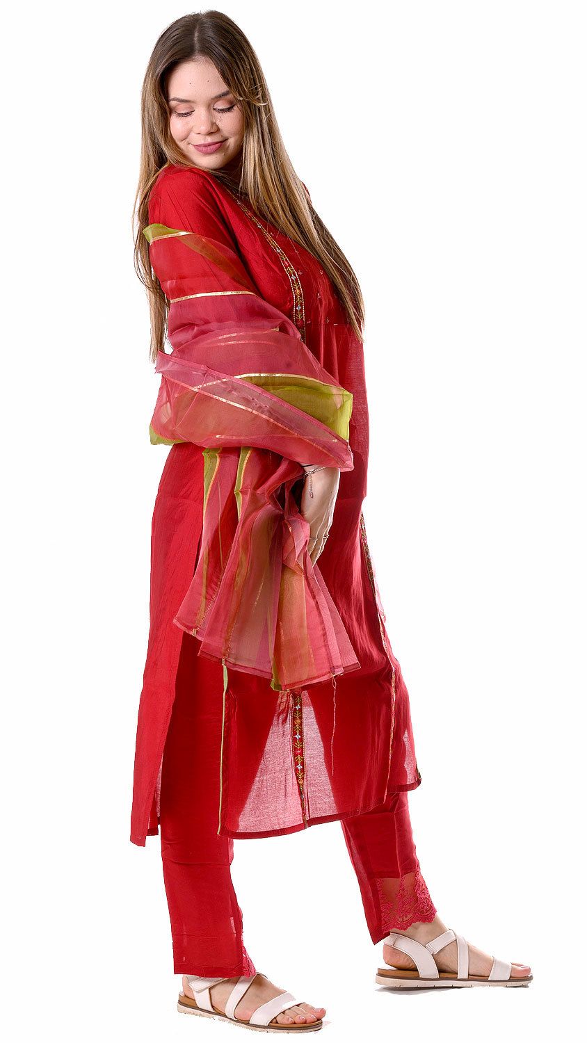 Velmi kvalitní a pohodlné pandžábí je vyrobeno z obzvláště příjemného materiálu. Jeho největší ozdobou je jak droboučká resham a zari výšivka s něžnými kvítky, tak jeho výrazná tylová dupatta, která díky své struktuře působí obzvláště nadýchaně.