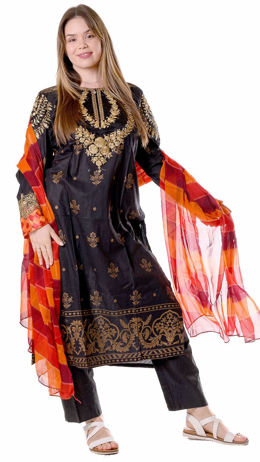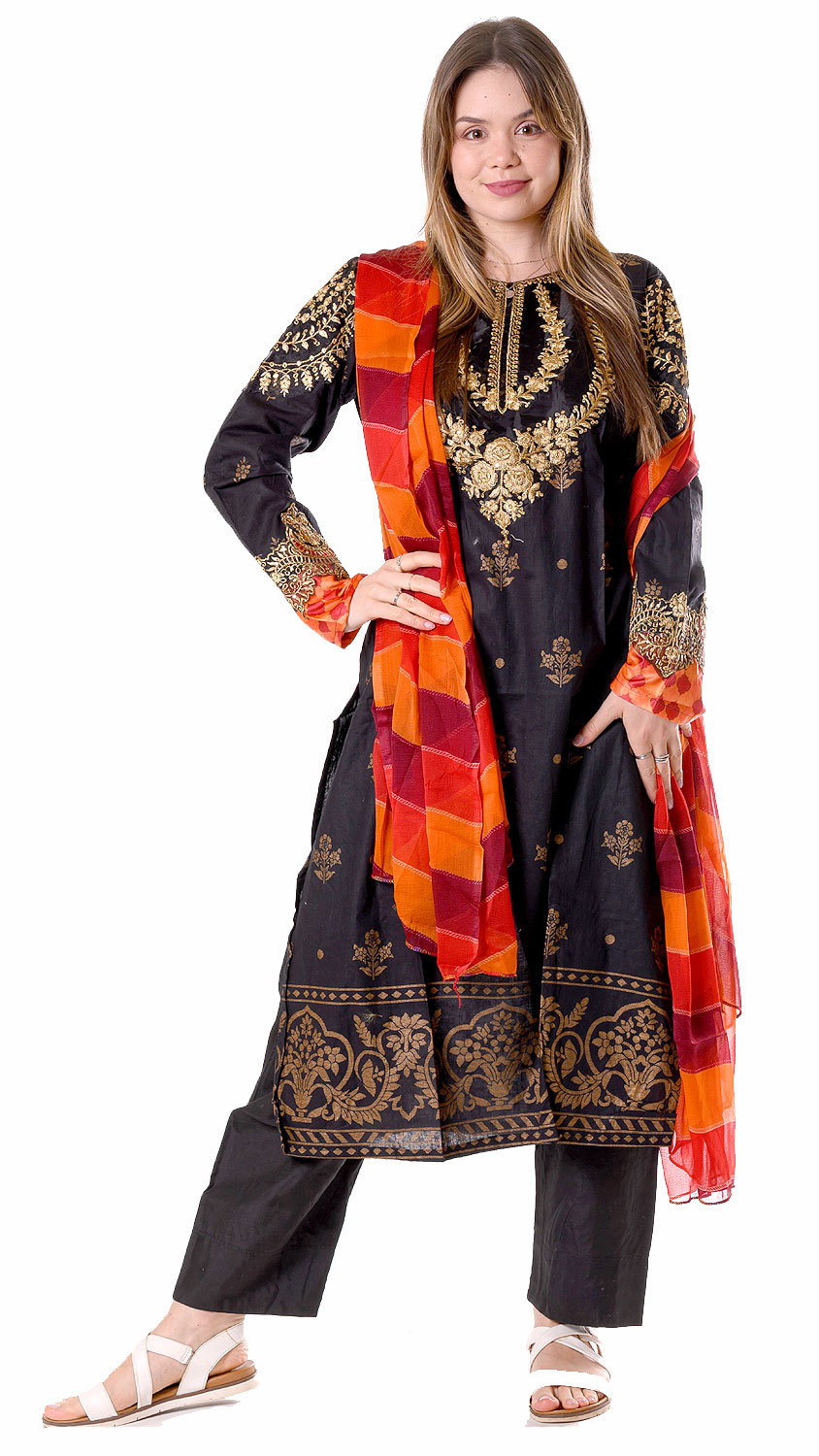 Skvostné společenské pandžábí ohromí svým nádherným precizně provedením zlatým zdobením, které tvoří nádherné orientální ornamenty a na černočerném základě doslova září. Při bližším pohledu na něm objevíte i droboučké flitříky, které jsou do vzoru vetkané. Pandžábí doplňuje ohnivá dupatta, která dokonale ladí se zakončením rukávů.