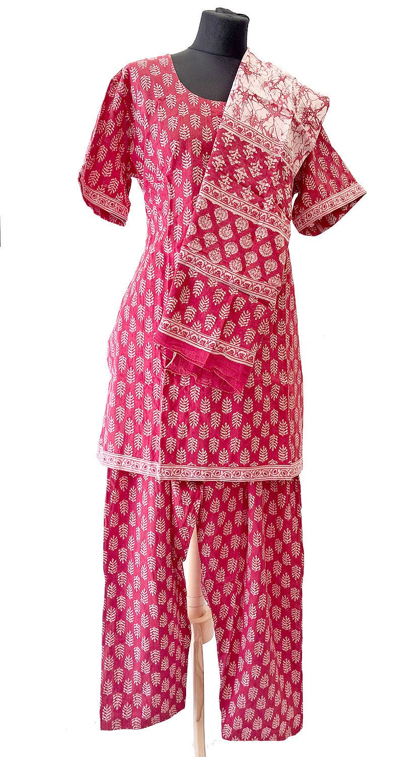 Tento komplet byl vyroben s láskou a péčí z nejkvalitnější rádžasthánské bavlny. Každý kus je zdoben tradičním indickým vzorem, který pochází ze slavných domácích tiskařských dílen v Jaipuru. Okouzlete vaše okolí jeho jedinečnou krásou a stylovým vzhledem! Komplet se skládá z prostorné tuniky, která vám dodá volnost pohybu a pohodlně se nosí, a širokánských kalhot, které nejenže perfektně ladí s tunikou, ale také vám poskytnou úžasný komfort. K tomu přidáváme mušelínovou dhupattu, která skvěle doplňuje celý outfit a může být také nošena samostatně jako elegantní hřejivá šála.