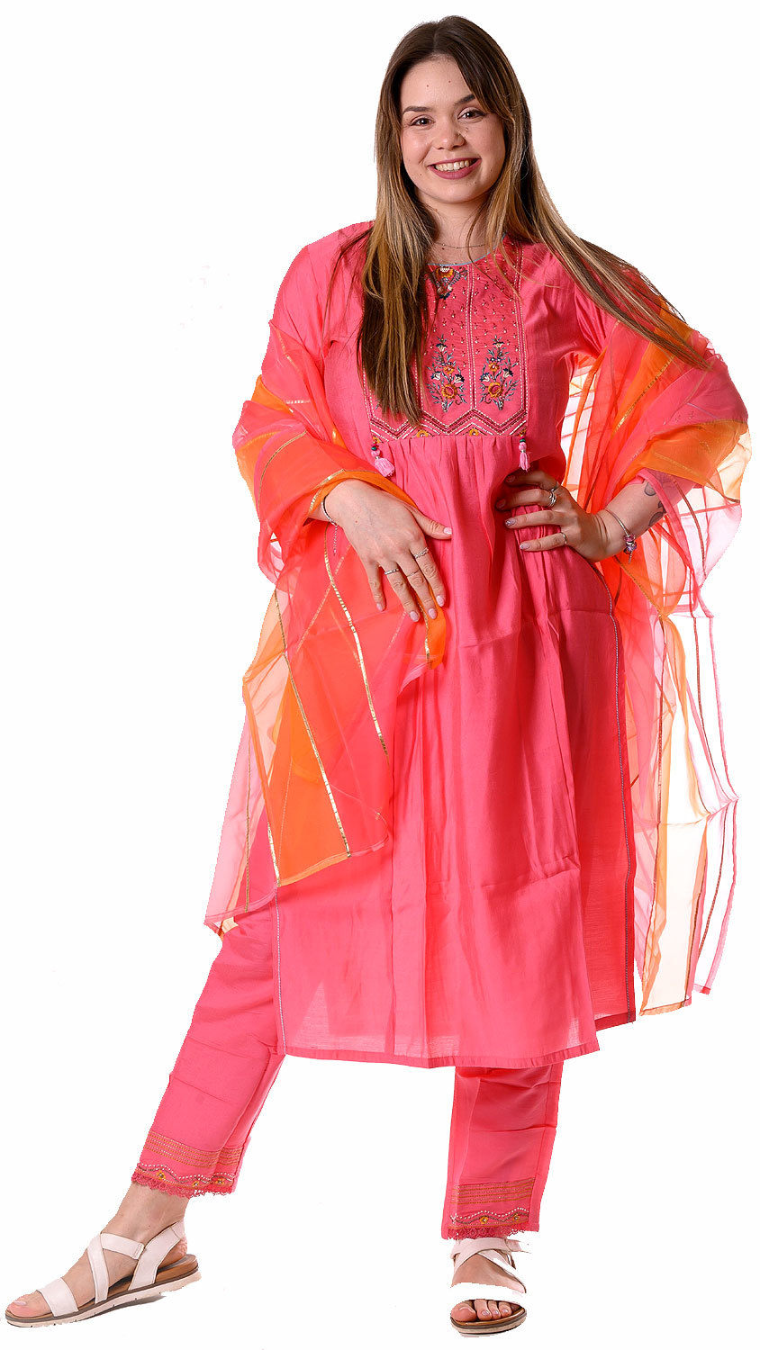 Tak toto pandžábí je top class! Čím blíže se díváme na jeho nádhernou výšivku, tím unešenější jsme - je tak dokonale precizní a detailní! Obsahuje jak resham, tak zari a v neposlední řadě i drobné korálky a umělé perličky. A to jsme se ještě nedostali k fantastické barvě - je růžová s lososovým nádechem. Proto obdivujeme jeho tvůrce, že k této nesnadno sladitelné barvě dokázali vybrat barvy dupatty, které dokonale ladí. Dupatta sama je vyrobena z pevného tylu, takže působí velmi nadýchaně.