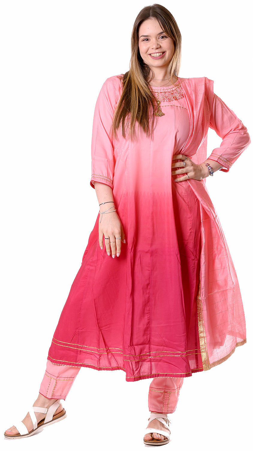 Toto exkluzívní anarkali pandžábí zaujme především dokonalým barevným přechodem mezi dvěma dokonalými odstíny růžové. Aby toho nebylo málo, váš obličej zarámuje nádherná precizní výšivka v růžových tónech a pravém zari. Je nádherně bohaté a doplňuje ho jednoduchá dupatta protkávaná zari nitkou a jednoduché kalhoty.