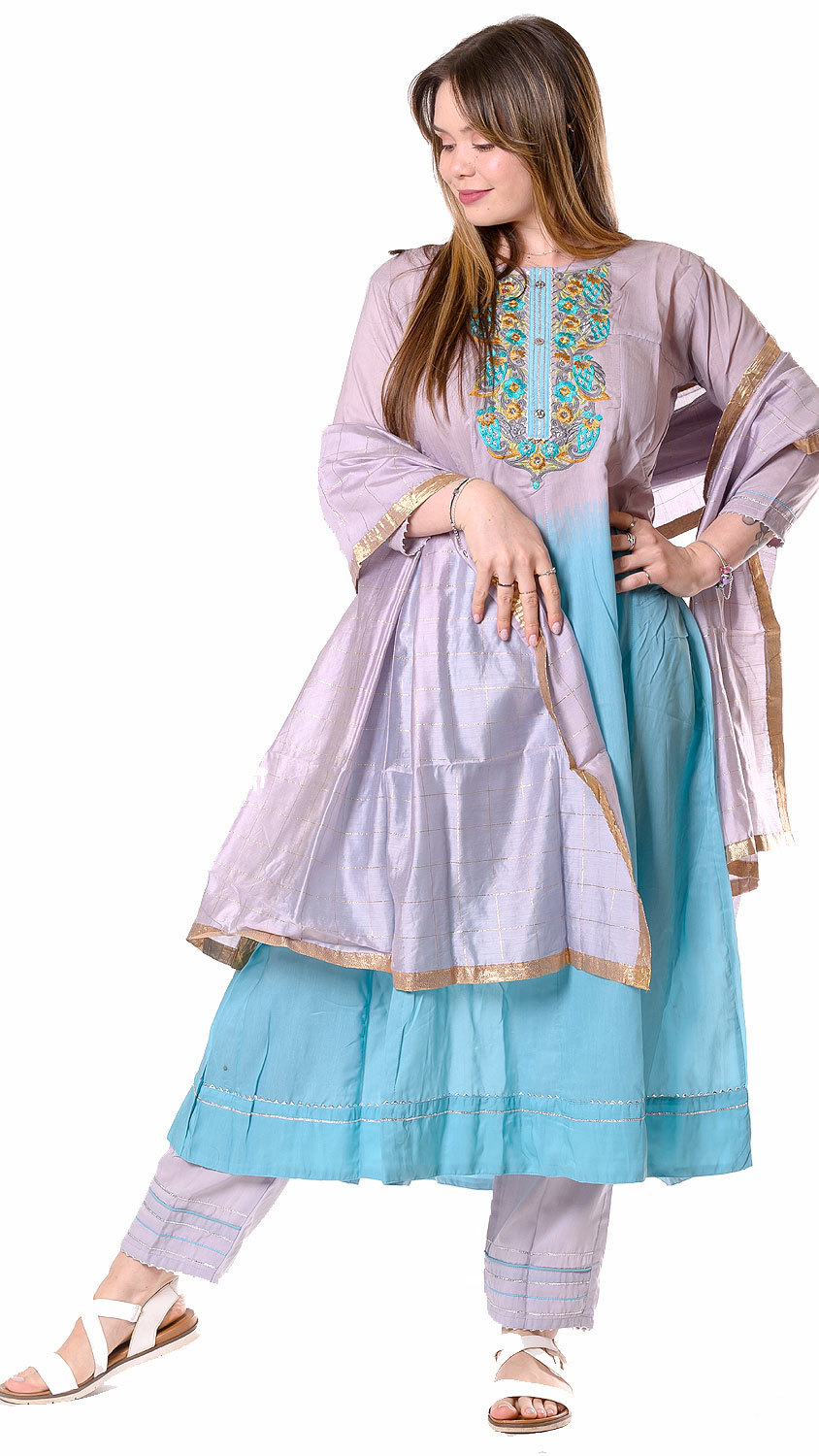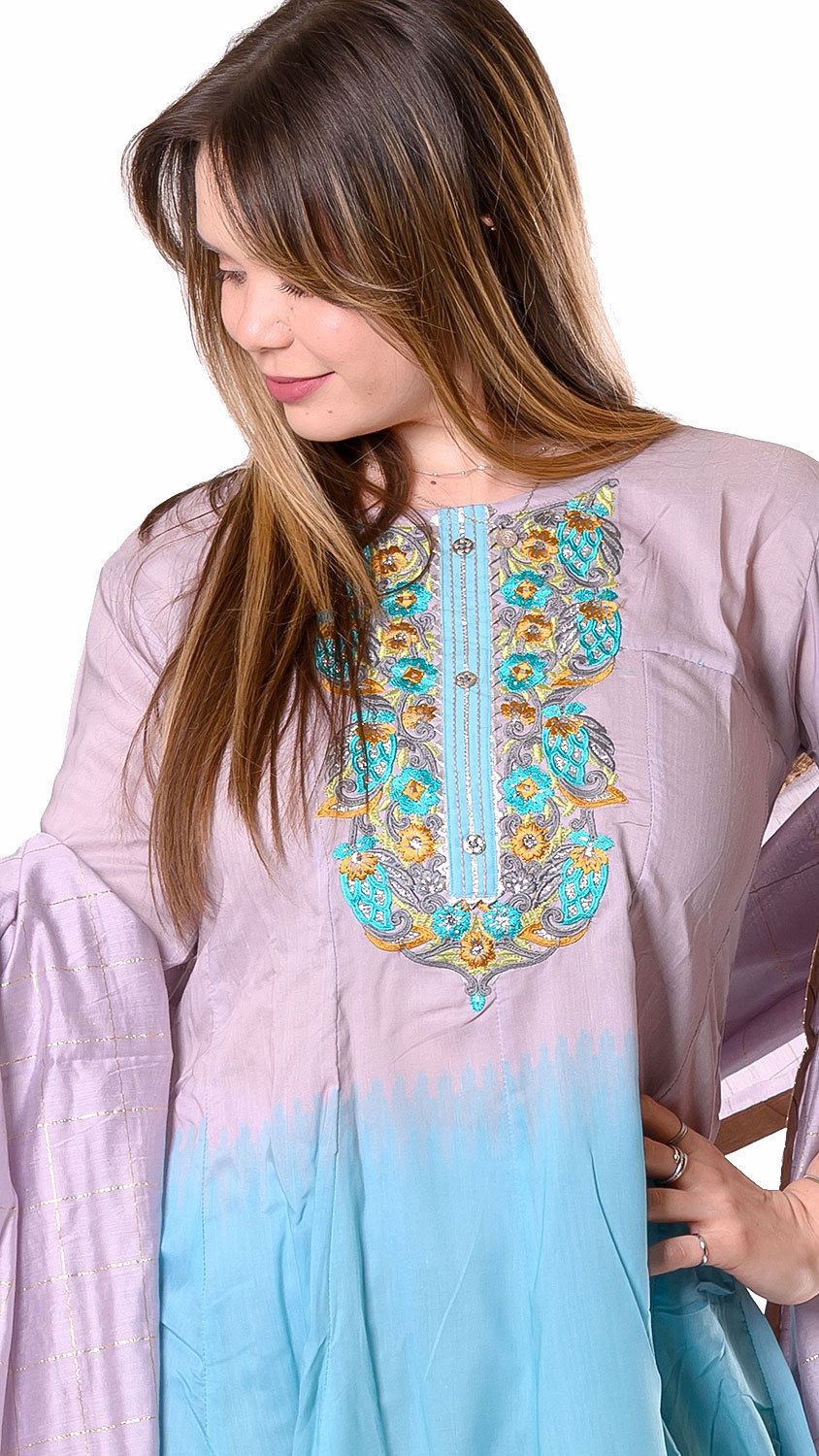 Wow, tak takhle barevná kombinace se nadmíru povedla! Základní šedofialová barva nechává vyniknout tyrkysovým prvkům a velmi jí sluší její stínovaný přechod do tyrkysové spodní části, která je úžasně bohatá. Pojďme se ale zaměřit na výšivku tohoto anarkali pandžábí - je dokonalou ukázkou zručného indického výšivkářství a nese se v perském stylu - jak vzorem, tak technikou.