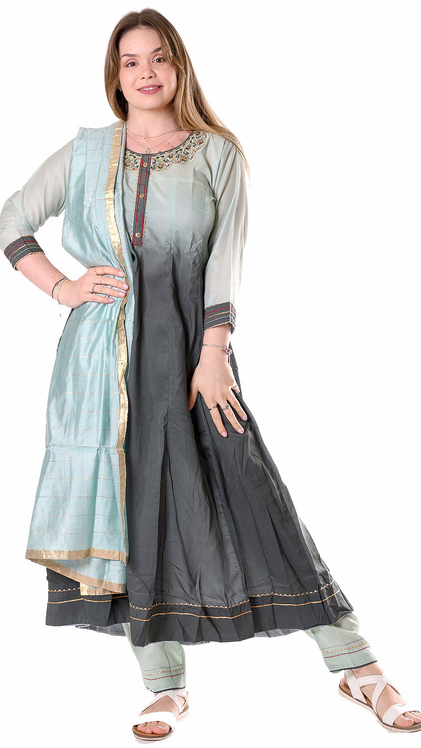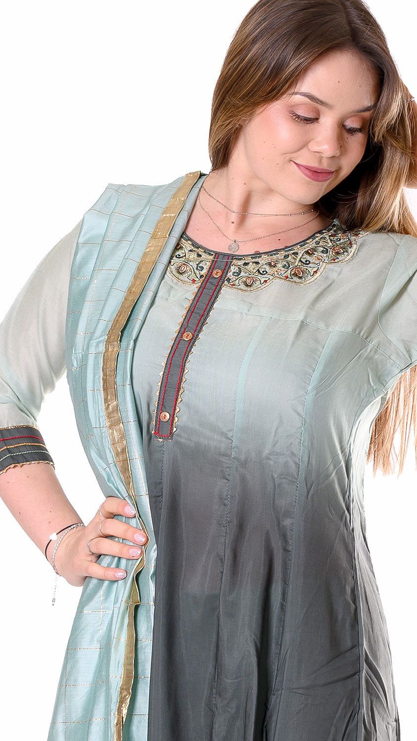 Krásné chladivé tóny zelené na tomto pandžábí působí uklidňujícím dojmem, obzvláště, když se do sebe plynule vpívají. Snad každou ženu potěší bohatý princeznovský střih, typický pro anarkali pandžábí. Fintilky zase zajásají nad nádhernou precizní výšivkou kole výstřihu, která dokonale zarámuje jejich obličej.