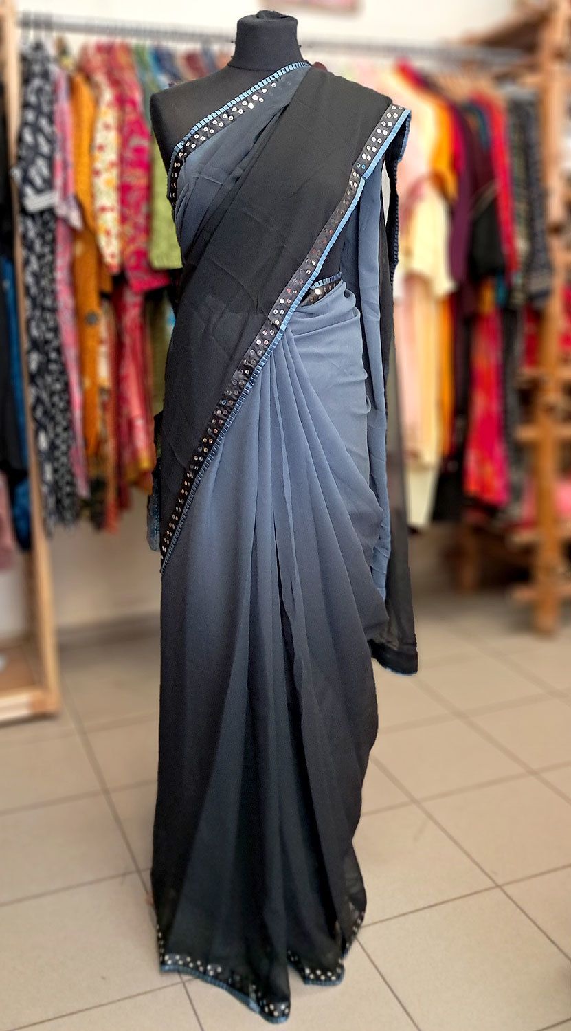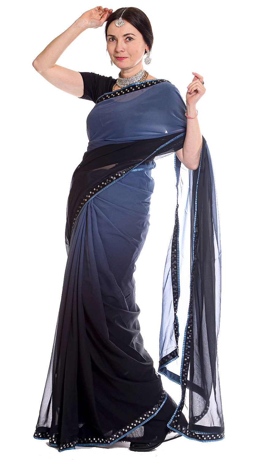 Jako úplnou novinku vám představujeme úúúúžasné stínované sárí, které na sebe poskládalo ty nejúžasnější, dokonale ladící barvy. Je vyrobeno z lehkého šifonu a lemuje ho třpytivá flitrovaná porta, simulující efekt našívacích zrcátek.