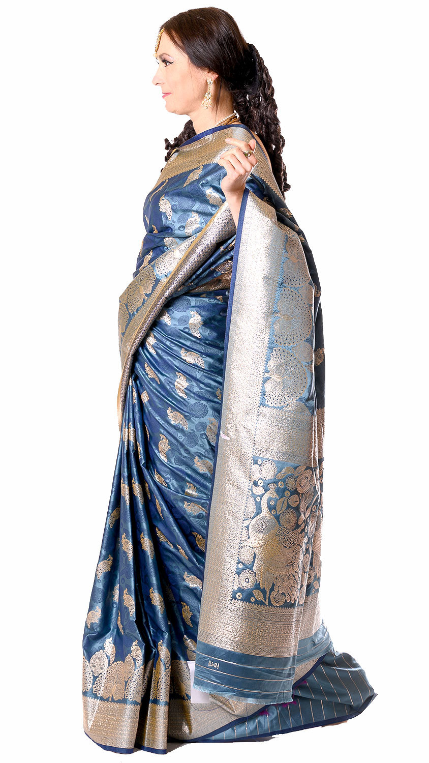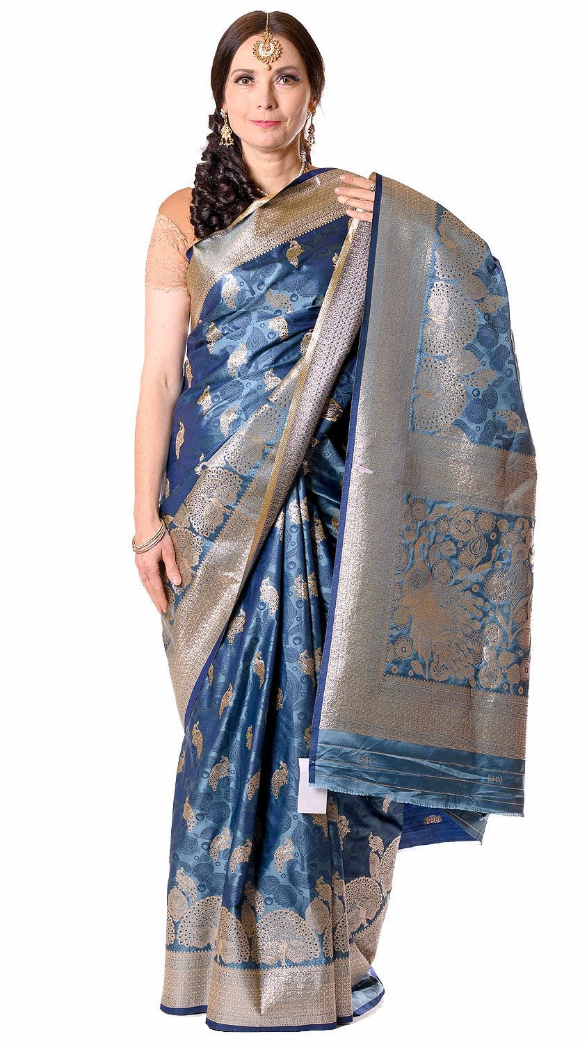 Luxusní brokátové sárí s pávy ocelově modré v8577