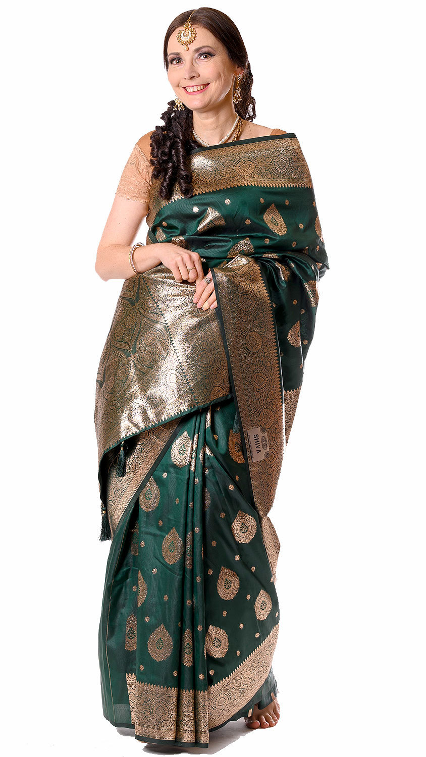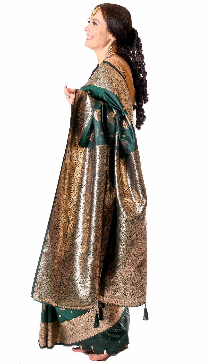 Luxusní slavnostní sárí z Váránasí lahvově zelené v8568