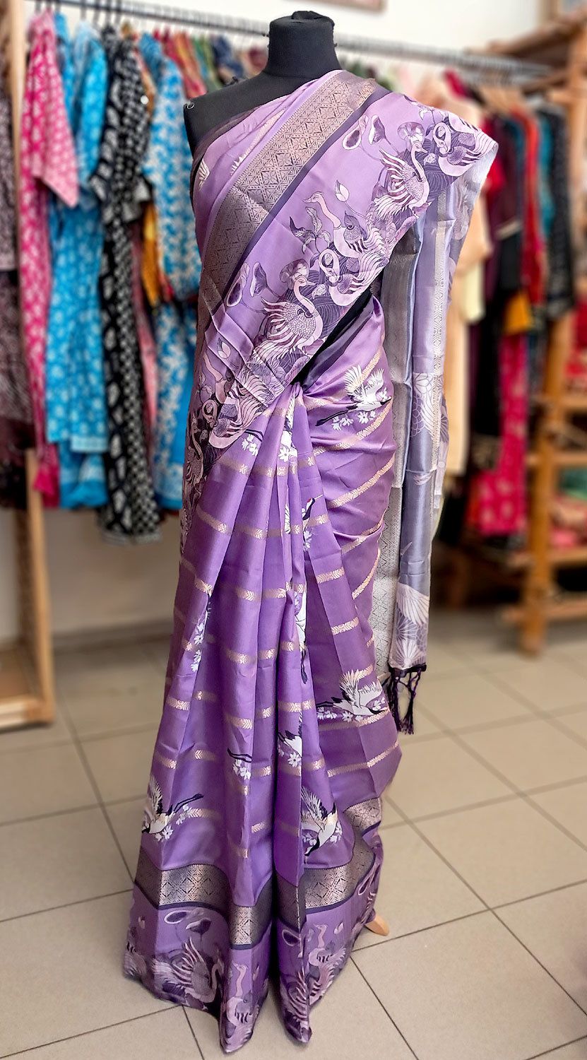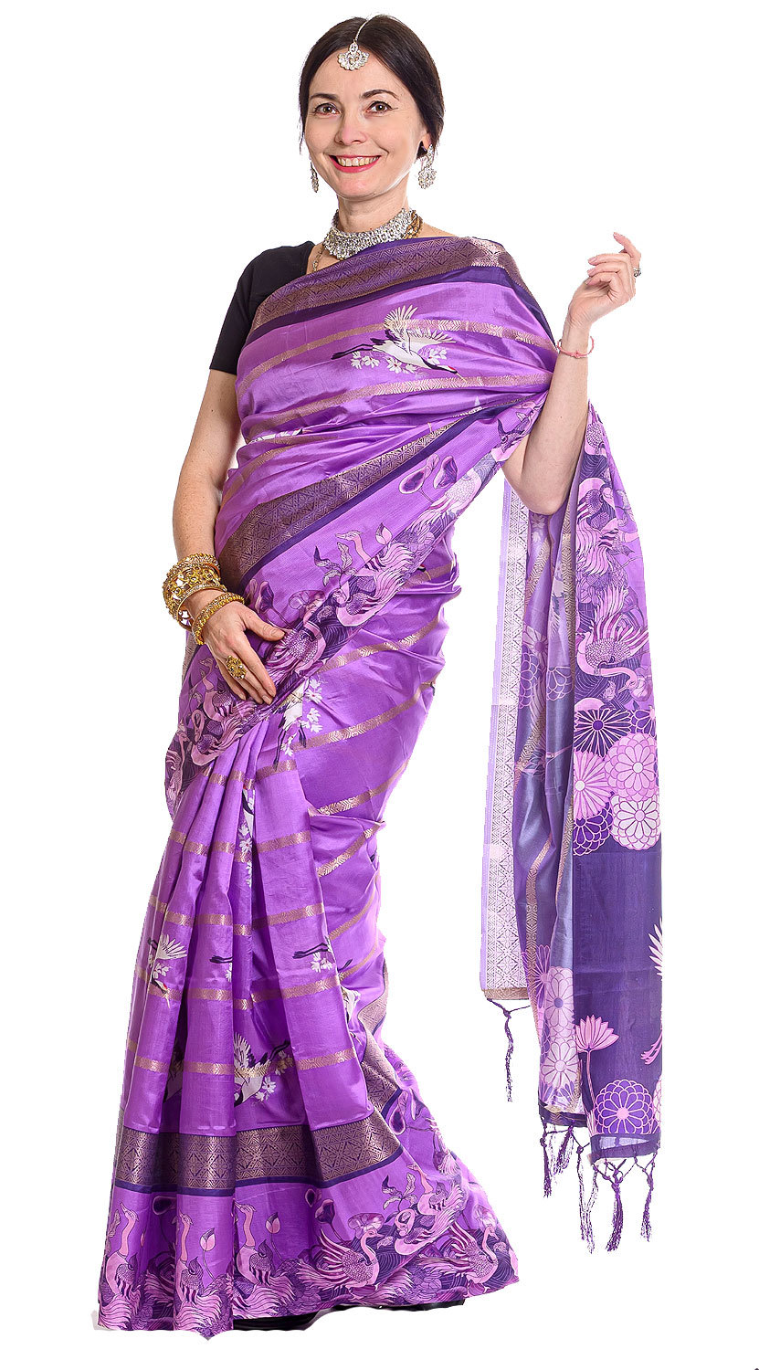 Toto jedinečné sárí spojuje eleganci indické tradice s jemnou estetikou Japonska. Zdobí jej motivy volavek a květů, které symbolizují harmonii, krásu a klid. Díky svému originálnímu designu se stává nejen nádherným oděvem, ale i univerzální látkou – můžete jej využít také k ušití kimona či jiného stylového oděvu inspirovaného Dálným východem.