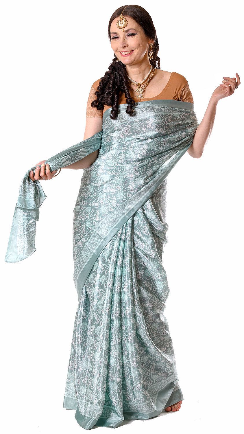 Saténové sárí s kašmírovým vzorkem ledově mátové v8604