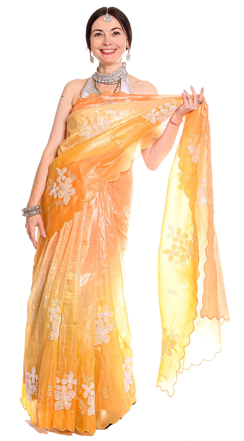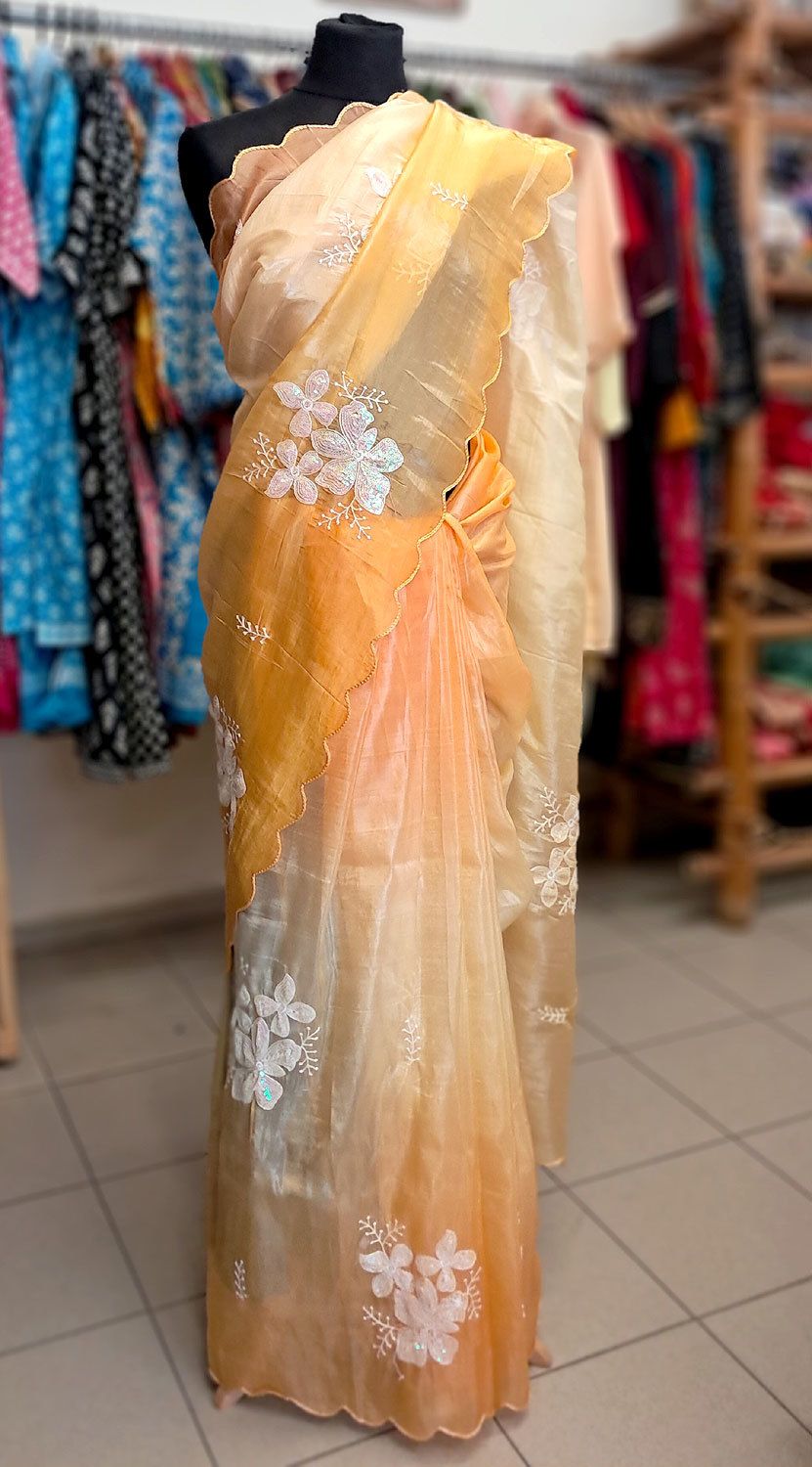 Elegantní sárí v jemných odstínech zlatavé a krémové barvy působí doslova kouzelně. Lehká, průsvitná látka s decentním leskem krásně splývá a dodává celému oděvu nádech luxusu. Výrazným prvkem jsou ručně vyšívané bílé květy s jemným třpytem, které dodávají sárí romantický a slavnostní vzhled. Okraje zdobí jemné vlnkování, které podtrhuje jeho ženskost a originalitu.