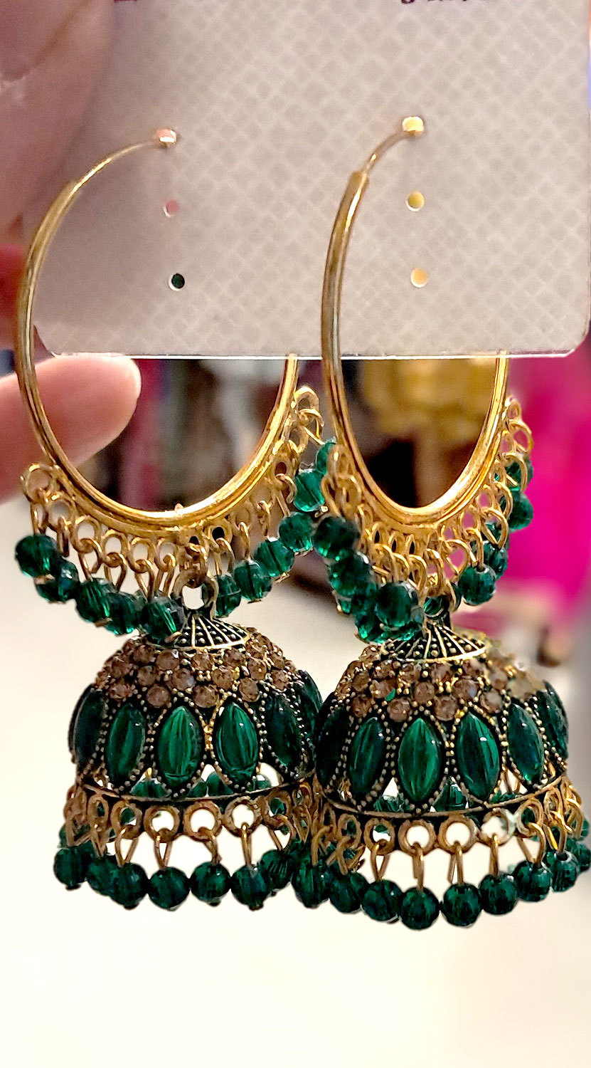 Překrásné zdobené kruhové náušnice s výraznou jhunkou jsou ozdobeny krásnými korálky. Dokonale se hodí jak na bollywoodský tanec, tak pro jiné speciální příležitosti.
