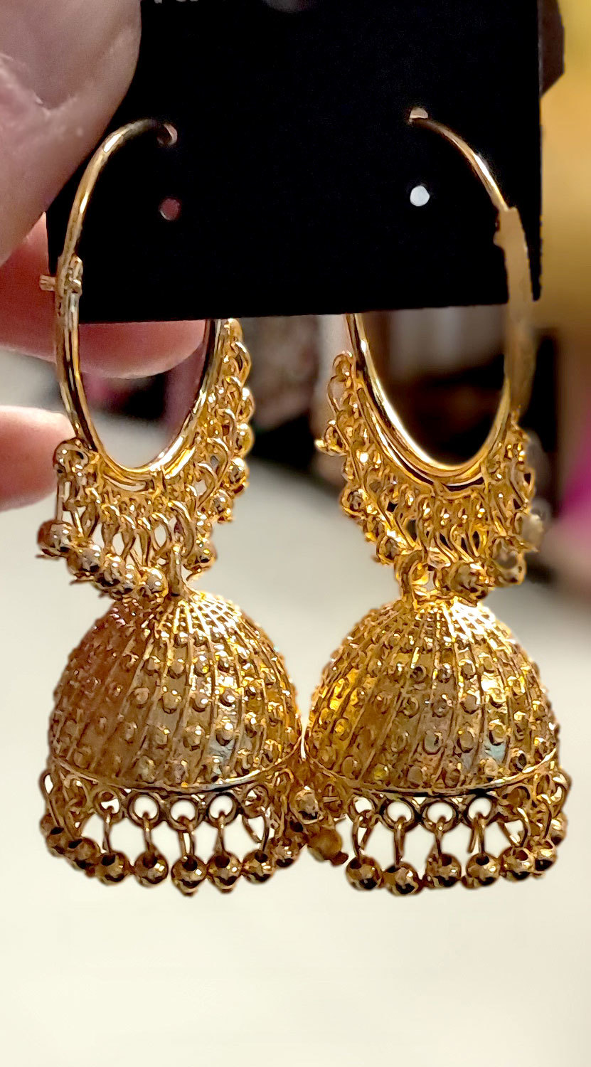Překrásné zdobené kruhové náušnice s výraznou jhunkou jsou ozdobeny korálky. Skvěle imitují 24 karátové zlato. Dokonale se hodí jak na bollywoodský tanec, tak pro jiné speciální příležitosti.