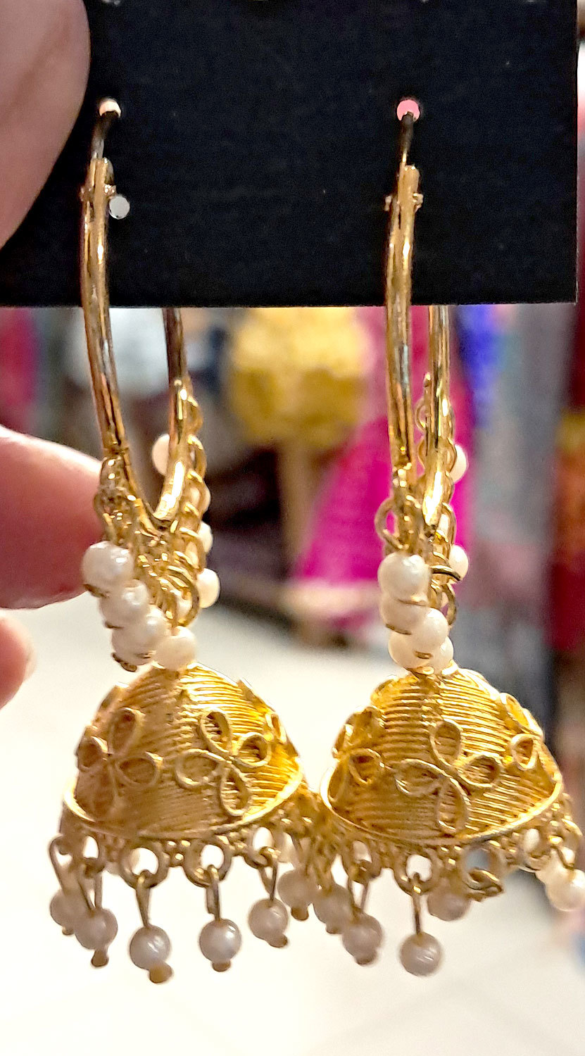 Překrásné zdobené kruhové náušnice s výraznou jhunkou jsou ozdobeny korálky. Skvěle imitují 24 karátové zlato. Dokonale se hodí jak na bollywoodský tanec, tak pro jiné speciální příležitosti.